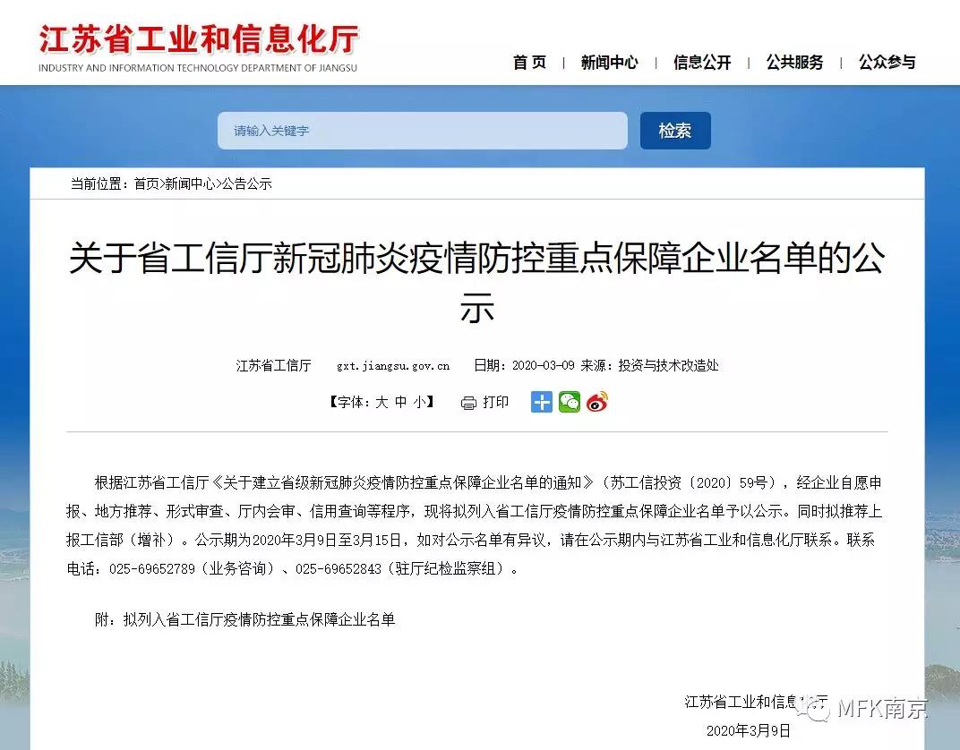 脊梁!江蘇省工信廳公示新冠肺炎疫情防控重點保障企業(yè)名單